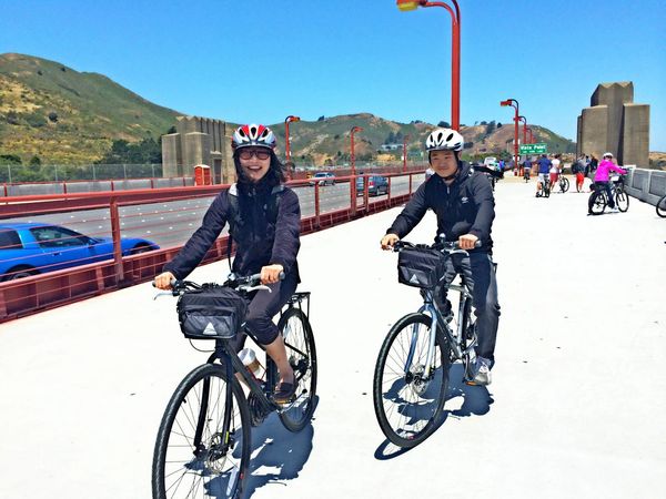 Let's bike the Golden Gate Bridge! The bridge is 1.8 miles long and the bike paths/sidewalks are on both sides of the bridge with fence to separate the car traffic. You are free to stop for photos, or turn around at any point to ride back.